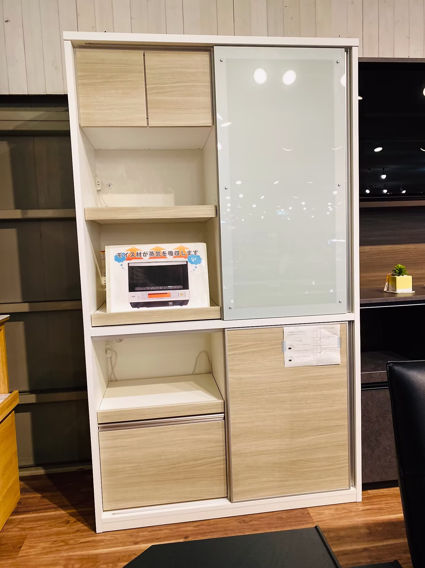 電子レンジや炊飯器などを左側に置いて、右側のガラスの方に、食器などを収納できます。