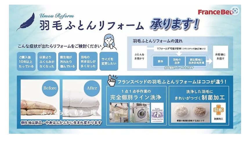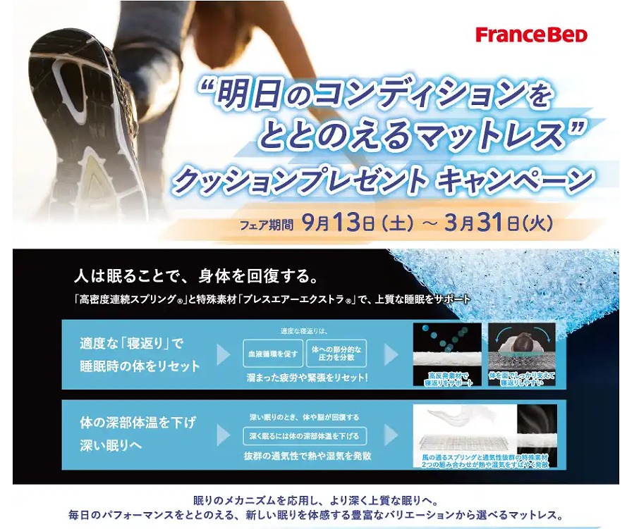 会場はフランスベッドPRスタジオ福岡(福岡県福岡市東区多の津1-4-1)。このチャンスに、最新モデルのベッドやマットレスを特別価格で手に入れましょう。