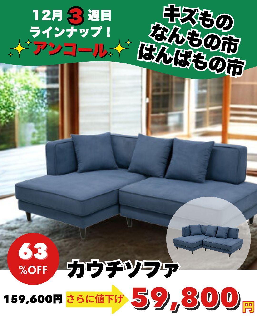 カウチソファ ㋱220,000円→79,800円