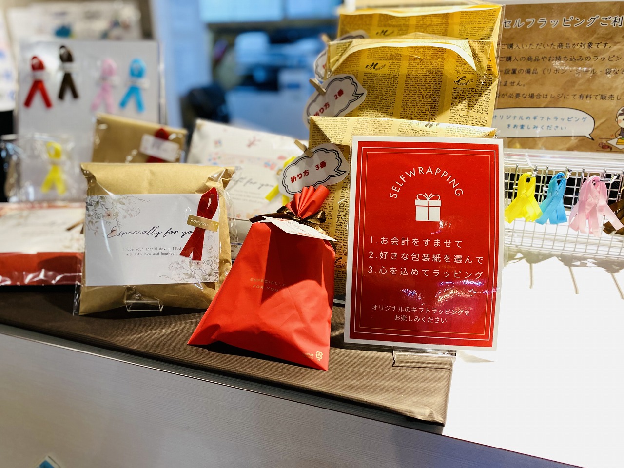 セルフでラッピングをされたい方は、雑貨商品をご購入後にスタッフまでお声かけください。 購入された商品のサイズに合わせて、袋や包装紙をお渡しいたします。
